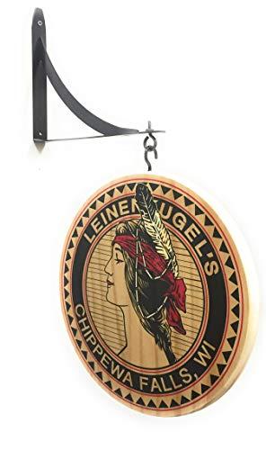 12" double sided Leinenkugel pub sign. High Quality Maiden image laminated to both sides of solid wood circle. Wall hanger is powder coated black for looks a durability. Wall hanger dimensions are 10" out from the wall and 8" tall.