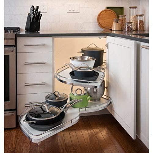 - Innovation and quality - Innovative mounting jig included; no measuring required. Convenience - Trays extend with a door opening to 85 degrees avoiding collision. Shelves are height adjustable every 2"