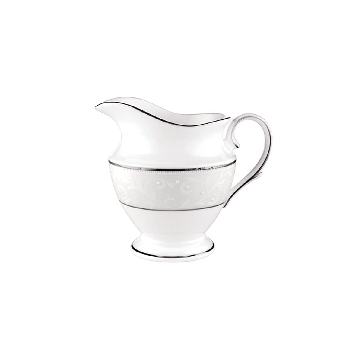 Reminiscent of another era of gracious warmth and hospitality, this fine bone china creamer from Lenox transforms the table into classic beauty. Serve an elegant tea and coffee, or a tasteful dessert with this graceful serving piece, along with the matching sugar bowl. The distinctive curves of the shape, the perfectly arched handle, and tapered spout makes pouring effortless into cups or over a bowl of fresh strawberries. The lovely design features a delicate white-on-white vine motif with pearly enamel white dots, contrasting with the decorative platinum band, for a bold yet pretty statement. Precious platinum accents emphasize the creamer's sweeping lines and trim its foot. Holding a generous 9-ounces of milk or cream, this piece echoes the shape of the teapot and coffeepot, and reflects the charm of the entire Opal Innocence pattern. Dishwasher-safe, this piece is backed by Lenox's lifetime replacement program. --Roberta Cruger