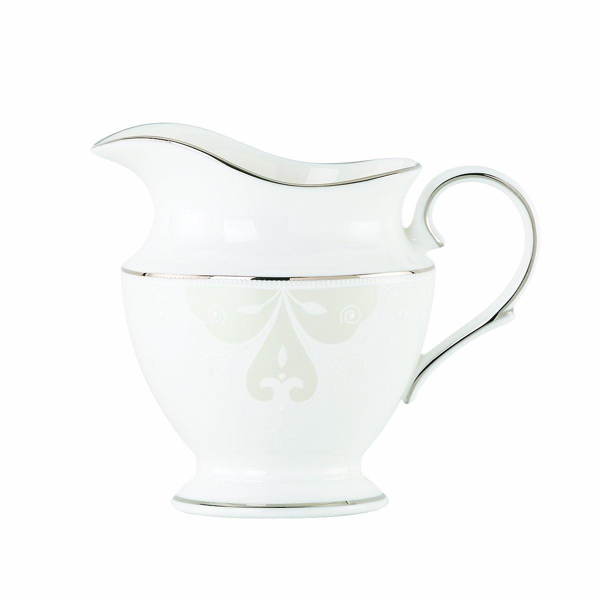 The ornate and stylish Opal Innocence Scroll Creamer features a shimmering white mica scroll motif with hand-applied enamel dots. This elegant and durable bone china creamer is accented in precious platinum and is dishwasher-safe for added convenience.