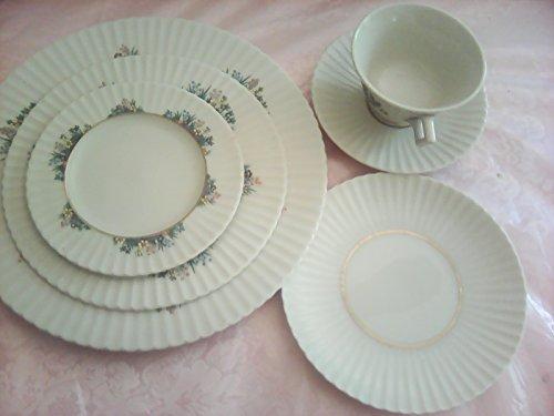 1 place setting. Place setting consists of dinner plate, salad plate, bread plate, teacup, saucer. 5 pieces total.