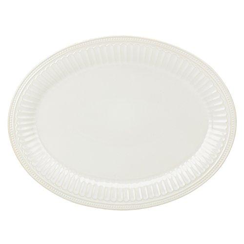 Thick grooves and petite beads are the focus of this durable white ceramic stoneware oval platter, as a subtle hand-applied tea stain along the edge adds a charm fit for the French countryside. This item is microwave and dishwasher-safe, for added convenience.