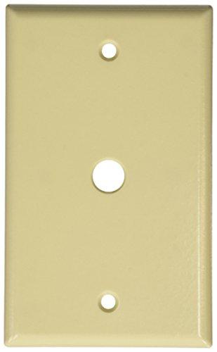 Leviton wall plate, standard size, telephone/cable, 4-1/2 in length, 2-3/4 in width, 0.22 in thickness, 1 gangs, thermoset, Ivory, smooth, box mounting, CSA certified, UL listed, 0.406 in hole diameter, for residential applications. Accent any wall covering with a wide selection of colors and finishes smooth face and rounded edges resist dust accumulation resistant to fading, discoloration, grease, oil, organic solvents and moisture scratches designed for high dielectric strength and arc resistance Underwriter laboratories listed, Canadian standards association certified. Standard size plastic telephone/cable wall plate. Box mount, 0.312'' hole.