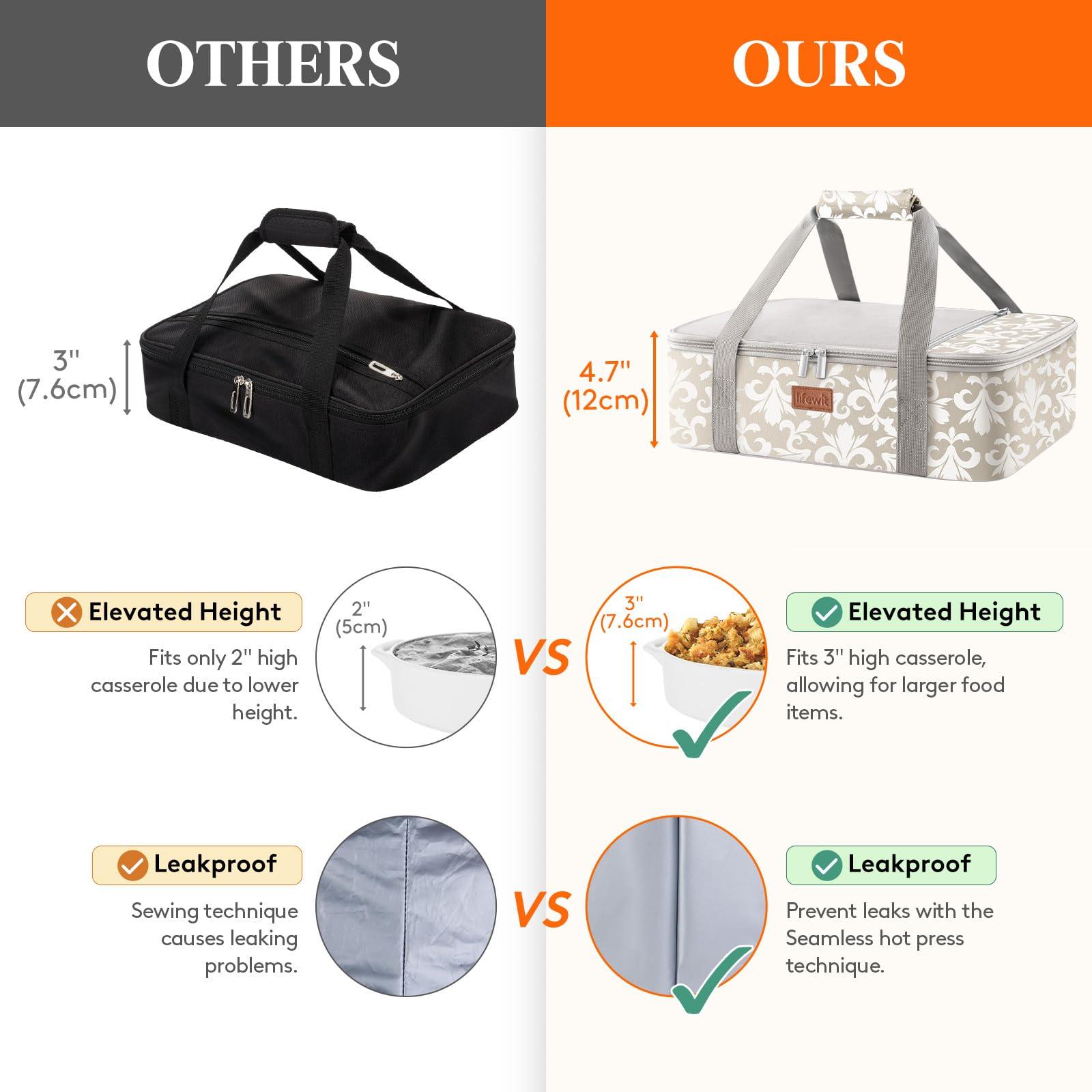 - Excellent Heat Retention: Our casserole dish carrier features food-grade aluminum foil and 7 mm EPE foam layers, keeping your food cold, hot, or fresh for up to 6 hours; The exterior is made of 600D rip-stop waterproof Oxford fabric for long-lasting use