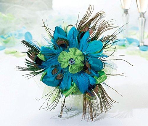 Lillian Rose 9" Peacock Feather Bouquet. This exquisite 9" bouquet combines peacock feathers with aqua feathers, green satin and green tulle. The middle flower is decorated with a rhinestone ornament. A 4" long clear acrylic handle allows for easy carrying.