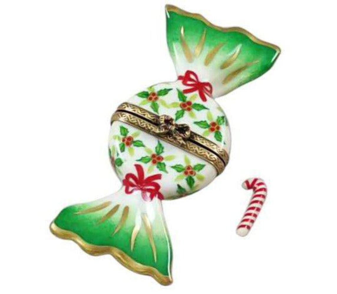 The Rochard Limoges "Holly Candy with Candy Cane" box is artfully and colorfully hand painted by premier artists using many of the same techniques that were used during their introduction in the 17th century. Steeped in history, Rochard Limoges boxes feature exquisite designs, superior workmanship, and the ultimate attention to detail. Hand Painted in Limoges, France
