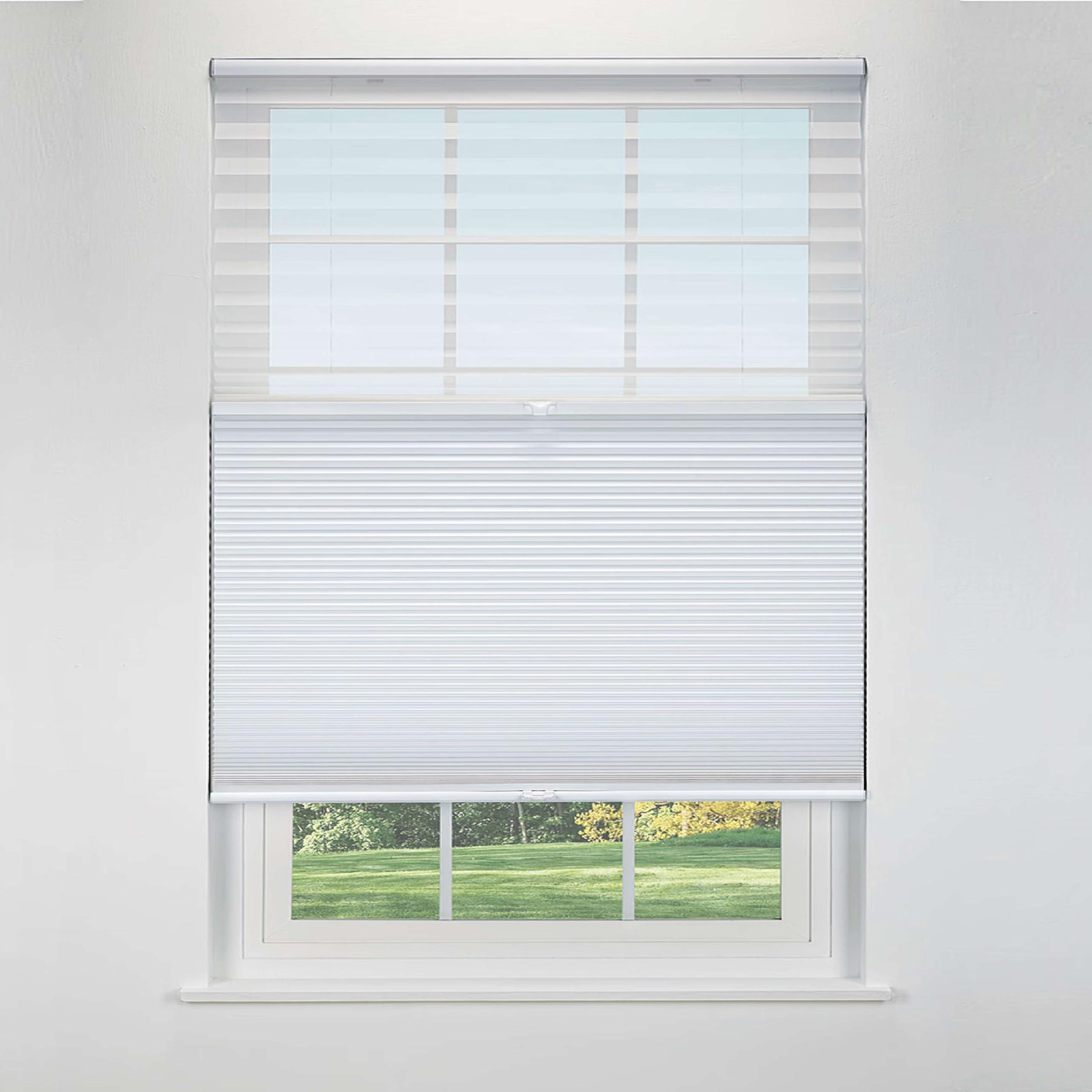 • | CUSTOM LIGHTING | The middle and bottom rail are both adjustable to your desired room lighting. The lift mechanism is completely cordless for easy operation and a clean appearance. Cordless shades are safe for children and pets. Light filtering and blackout options are available. Please note that this is NOT a top-down bottom-up shade, the upper pleated sheer does NOT lower from the top rail.