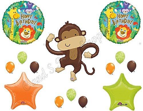 A 14 piece Monkey Happy Birthday balloon decorating kit! Fun balloons to display at your birthday party! You will receive with this kit: One (1) EXTRA LARGE 40" Linky Monkey mylar shape balloon. Two (2) 18" Happy Birthday Safari animals round mylar balloons. Two (2) 18" Star shape mylar balloons...1 orange and 1 kiwi green. Nine (9) 11" Coordinating latex balloons...3 Kiwi Happy Birthday print, 3 orange and 3 brown. All balloons are new and shipped uninflated. Just add helium!