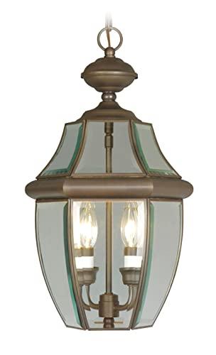 Collection: Monterey, Material: Brass, Finish Color: Bronze, Width: 10.5", Height: 19", Chain Length: 36", Lamping Type: Incandescent, Number Of Bulbs: 2, Wattage: 60 Watts, Moisture Rating: Dry Rated, Desc: The Monterey outdoor lighting features clean, crisp lines complemented by the graceful curves of beveled glass. Crafted from sturdy solid brass this handsome colonial styling makes this fixture a perfect addition to your outdoor spaces. Canopy Included: Yes / Shade Included: Yes / Canopy Diameter: 5.00. ,