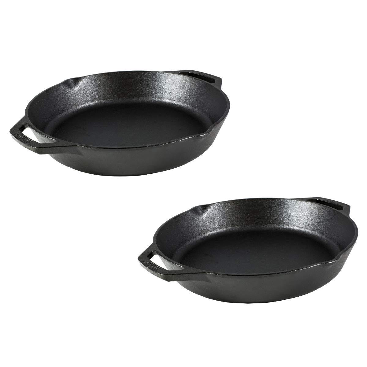 Create healthy Spanish omelets in this set of skillets from Lodge. They're made of cast iron for optimal heat retention so you can enjoy well-cooked, deliciously crispy food. Each skillet has two helper handles that give you a secure grip for easy transport. Pour spouts on both sides make it easy to remove hot liquids without spills or splashes. Safe to use on the stovetop, oven, or grill, this set of skillets is extremely versatile; they can even be used on an induction surface. These dual-handled skillets come pre-seasoned so you don't have to wait long to enjoy that tasty strawberry pie recipe. 12 inches diameter x 2-1/4 inches tall