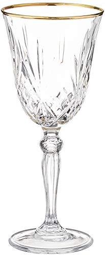 Set of 4 Crystal White Wine Glass set with a 24K gold band design, by Lorren Home Trends DaVinci line. The Siena Collection features an elegant lead free cut crystal design with a brilliant gold band for a luxurious look. Made in the Tuscan region of Italy. Each glass measures 3" x 3" x 7.25" tall and holds 6 ounces of your favorite beverage. Hand Wash. Made in Italy.