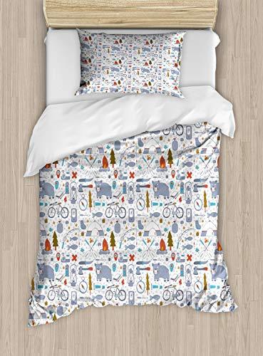 Lunarable Lunarable Camping Duvet Cover Set, Cartoon Bear Tent and Compass Outdoor Hobby Theme Hiking Doodle, Decorative 2 Piece Bedding Set with 1 Pillow Sham, Twin Size, Vermilion Bluegrey