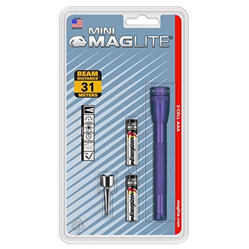 Turn it on and see the light with this Mini MagLite. Just twist the flashlight head and you can change the beam from spot to flood, positioning the light exactly where you need it. It's anodized inside and out for improved corrosion resistance and durability, with a self-cleaning switch that virtually eliminates oxidation. The high grade O-rings at each opening ensure resistance to water and shock while the low resistance circuitry allows a more efficient use of the batteries. This flashlight also includes a candle mode feature for convenient, hands free light. The diamond-knurled grip helps you hang on to it in tight spots, and the spare lamp in the tail cap may be just what you need to get out of a dark situation. Manufactured in the United States. Color: purple