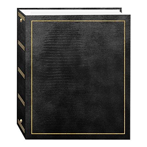 This leatherette cover photo album features gold stamping and Fast-Stick magnetic pages with a clear plastic overlay that self-adheres to the page, securely holding photos. The album's 8.25 x 10.5 inch pages hold many size photos including 2.5 x 3.5 inches wallet, 4 x 6 inches, 5 x 7 inches, 6 x 8 inches and more. It initially contains 100 pages (50 sheets). The 3-ring binding accepts refills (Style No. RLM). Photo safe: acid and PVC emission free.