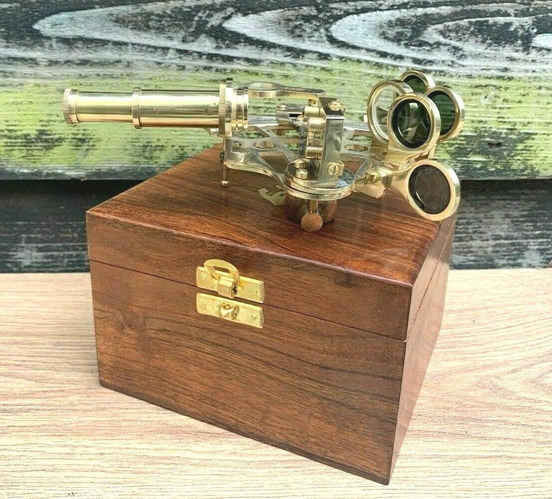 Marine Antique Brass Sextant with Wooden Box Navigation Nautical Marine Vintage Sextant with Wooden Box