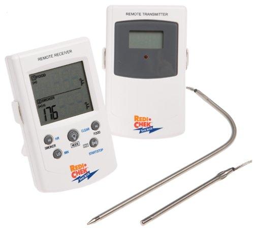 Smoking meat and fish properly can take days. So, rather than going out to the smoker to check the temperature time and time again, simply install a RediChek Remote Wireless Smoker Thermometer and rest at ease. This handy thermometer monitors smoker air temperature and food temperature from up to 100 feet away. And, if the temperature drops too low or jumps too high, the RediChek alarm goes off, so there are no spoiled batches-just certainty that every batch of smoked salmon is perfection. The RediChek can also be used with an oven or grill for peace of mind while baking, barbecuing, and broiling and for fewer trips to the kitchen. Best of all, the RediChek is wireless, so installation is a snap. Your purchase includes four AAA batteries for out-of-box use. --Brian Olson