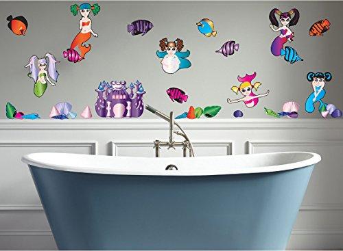Create an undersea world in your children's room with these 34 individually cut out Jewel colored Mermaid Wall Stickers set on two sheets 15in by 11.5in.. Just peel and stick these Mermaid wall decals to almost any smooth surface to create a wonderful mermaid mural that your child is sure to love. There are 6 Mermaid wall stickers The Orange Mermaid is 9.5in, by 4.5in wide Auqua Mermaid is 6in by 4in Green Mermaid is 7in by 5.5in Pink Mermaid is 7.5in by 5in. Blue Mermaid is 6in. by 5.5in. The Mermaid Castle wall sticker is 8.5in by 6in There are 8 colorful fish that vary in size from 4.5in by 3in to 3.5in by 3in. There are also 19 different color Sea shell stickers that match the Mermaid decals. The vary in size from 3in by 2in to the smallest shells about 3inches by 1in