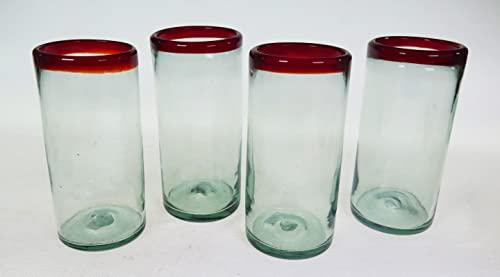 Every day is a fiesta whether serving lemonade or ice tea or that special drink. These glasses are crafted in Mexico from recycled glass. Decorated with a red rim (fused into glass). Sturdy enough for everyday use. Mouth-blown lead-free glass. Dishwasher Safe Size: approximately 7 inches high 3 inches wide and holds around 20 oz. Care instructions: Our Mexican Glassware is individually mouth blown, hand formed and made from recycled glass. Trapped bubbles and slight variations in form, capacity and color are natural and charming features of the glassware. Although it is quite durable, this glass is not tempered so some extra care is necessary. A cooling-off period is essential after the glassware is removed from the dishwasher. Extreme temperature changes may cause thermal shock and cracking. This glassware is not suitable for serving hot beverages.