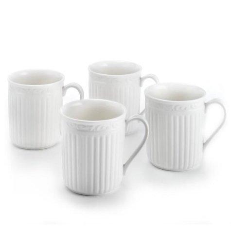 The fluted bands of this dinnerware and column-like detailing recall classical Italian architecture. Complete suite of accessories to create a classically stylish casual dining statement. Distinctly beautiful design of scrolls and fluting. Perfect for casual entertaining. Stoneware. Dishwasher and microwave safe. Set of 4 mugs, each holds 11 oz.