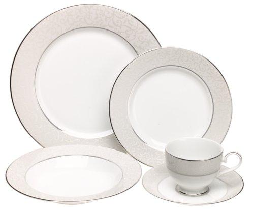 Parchment dinnerware collection features a gentle gray border embellished with a beautifully detailed scroll design. This chic and elegant collection is accented by inner and outer borders of platinum. Crafted of porcelain. Dishwasher safe but not microwave safe. When washing gold or platinum banded dinnerware in the dishwasher, use a gentle cycle and turn off the dishwasher before the drying cycle, or allow the dinnerware to cool before handling it. The high temperature of the heated drying cycle can cause the precious metal bands to soften. This 5 piece place setting includes a 10-3/4 inch dinner plate, 8-1/2 inch salad plate, 8-1/2 inch soup bowl (12 ounce) , 9 ounce tea cup and 6-1/2 inch tea saucer.