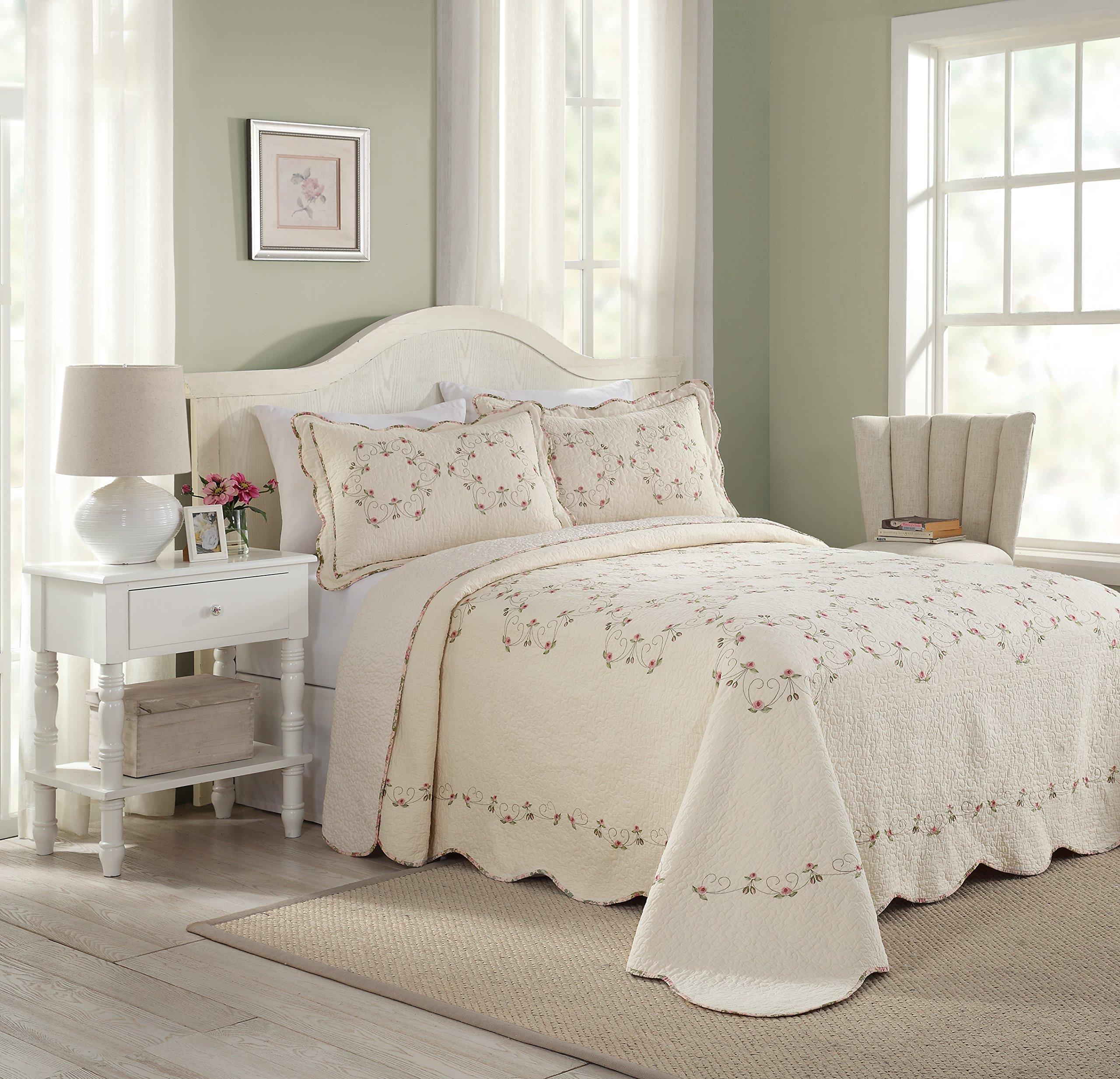 - This romantic ivory ground stunner is intricately embroidered with the sweetest pink roses, delicate trailing leaves and graceful flourishes. The scalloped hem detailing is bordered with a ditsy floral print in pink. The allover quilting pattern is a traditional vermicelli type stitch. Coordinating sham sold separately.