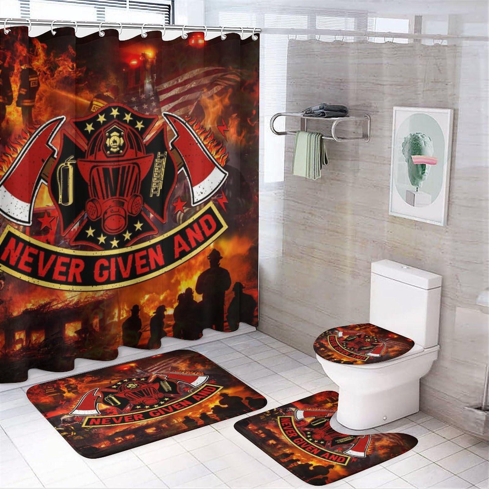 - HIGH QUALITY MATERIALThis JretailAx Modern Hero Theme Fireman four-piece set shower curtain is made of polyester fiber,which is waterproof and durable. Non-slip bath mat and rug are made of high quality coral pile,waterproof oxford cloth material.Comfortable,soft and durable. The non-slip backing is durable and helps you enjoy a pleasant bath time.