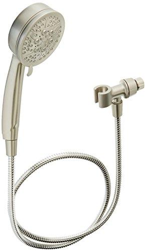 - Includes five function 4 inch diameter spray head handshower, 60 inch metal hose and shower arm bracket