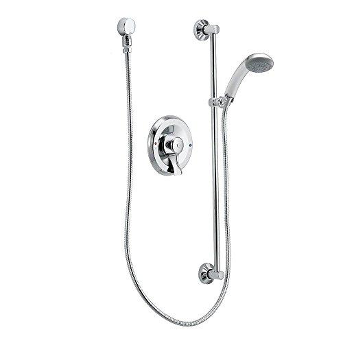 This single-handle handheld shower system has a Posi-Temp pressure-balancing valve that maintains water pressure and controls temperature, a 30-Inch slide bar, drop ell, vacuum breaker, a 69-Inch metal hose and mounting hardware. The pressure balancing cycle valve design has 1/4 turn stops, the rubber nozzles are quick cleaning and the chrome plated metal construction provides a bright, highly reflective, cool grey metallic look. The temperature handle operates counterclockwise through a 270 degree arc, with off at 6 o' clock and maximum hot at the 9 o' clock position. The pressure balancing mechanism maintains the selected discharge temperature to +/- 2 degrees. The handheld shower head has a flow of 2.5 gpm maximum at 80 psi, and a single function spray pattern. This shower system features vandal resistant screws, a 1222 cartridge design that accommodates back-to-back installations, and is ADA complaint for the temperature valve levers. Moen Commercial offers a full line of faucets, electronic flush valves and showering systems built to withstand the harshest conditions in commercial and institutional buildings and construction. They're built for constant use, and occasional misuse. They're built for the real world.