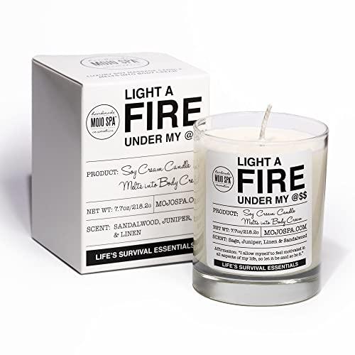 Feeling lazy or in a slump? Can't get what you need done? Fire up that motivation with this clean burning soy massage candle. As it burns, say the motivating affirmation, smell the energizing, fresh aroma of clean linen, cashmere, juniper, sage, and massage the ultra-moisturizing melted soy cream to help you feel focused to start accomplishing your tasks. A great motivational and witty gift to give students, coworkers, friends and family trying to ace that exam, get that promotion, or start accomplishing their goals! Makes for an ideal unisex gift for both men and women for graduations, birthdays, and the holidays. Lab-inspired packaging with a sleek black-and-white design complements any type of modern decor.