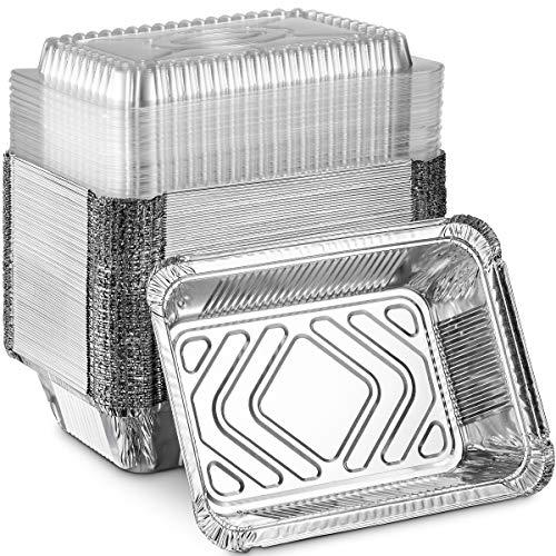 - AFFORDABLE, DURABLE, VERSATILE, REUSABLE, THEN DISPOSABLE: Just a single pack of our 50-count aluminum pans with lids effectively replaces heavy dishes, serving trays, cling film, plastic jars, and plastic bags. Cleanup is a breeze too: gather any leftovers, then chuck the pans into recycling.