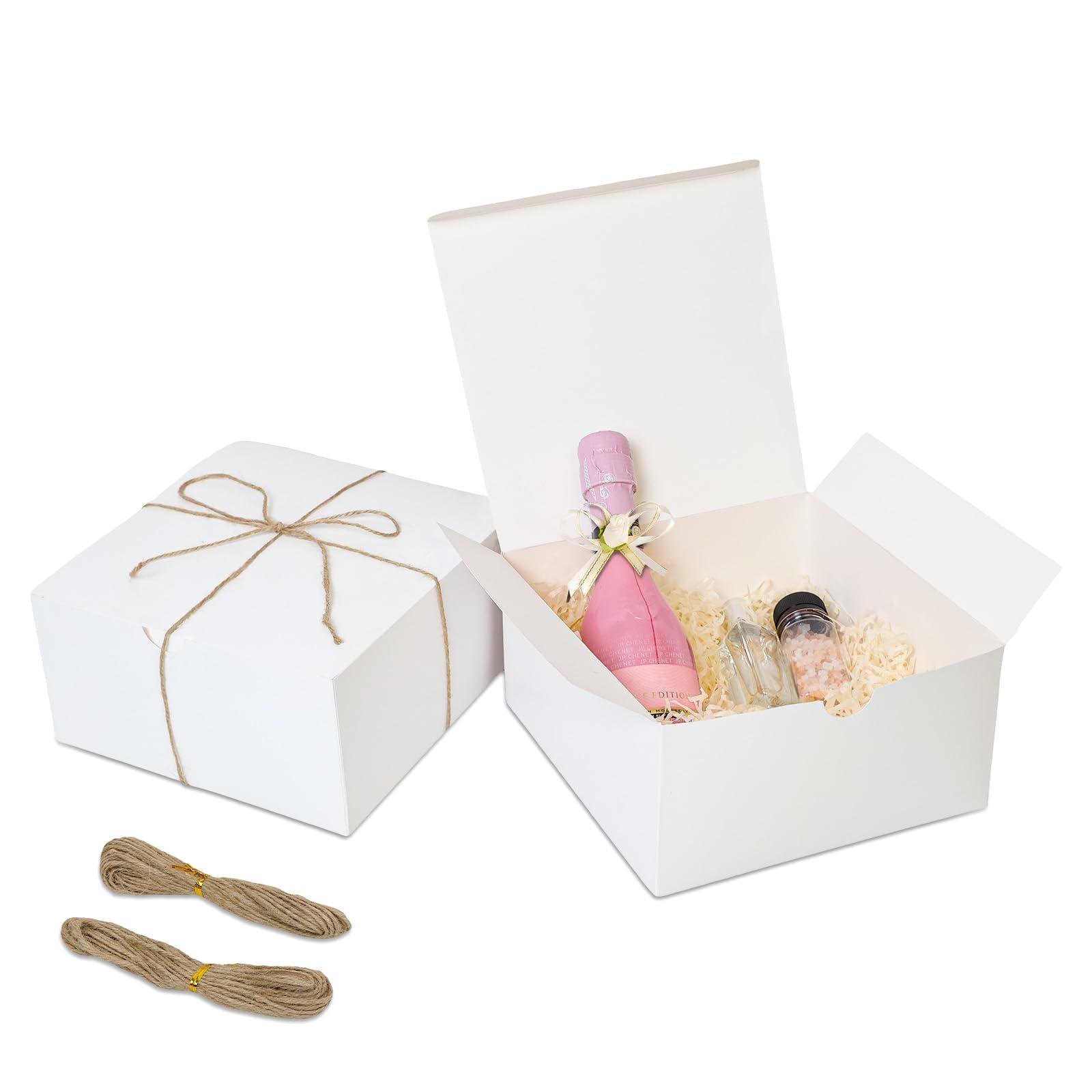- White gift boxes: 12 pack paper gift box set with 2 bundles of twine( 66ft in all). Twine is convenient for you to bind the box, and make the box stronger, adding the fun of DIY. Excluding green plant decorations.