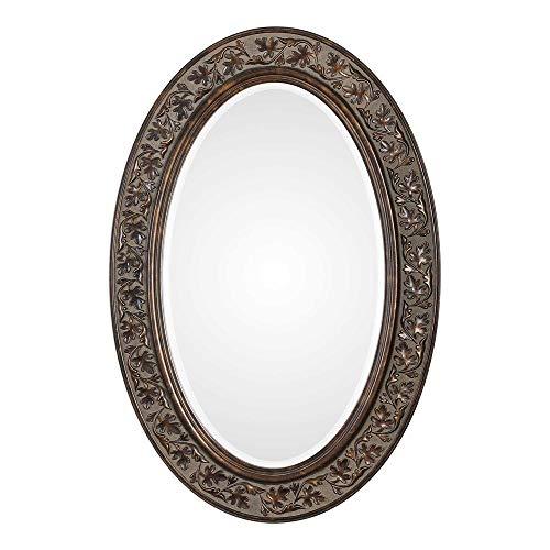 - CONTEMPORARY DESIGN: Bring an elegant look to any room with this 23 W x 34 H bronze oval mirror. The oval frame features an embossed flowing leaf design, finished in an aged bronze with antique gold undertones. The mirror has a 1" bevel. May be hung either vertical or horizontal.
