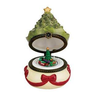 Mini Animated Christmas Tree Music Box. By Mr. Christmas, Item #15001 European-styled, porcelain piece opens to reveal miniature animated scene inside. One wind-up song ("O Christmas Tree") plays as the delicate scene turns. Measures Approx. 4"H. Material: Porcelain. This is brand new, perfect, first quality merchandise.>Please Note: Music box does not come gift boxed.