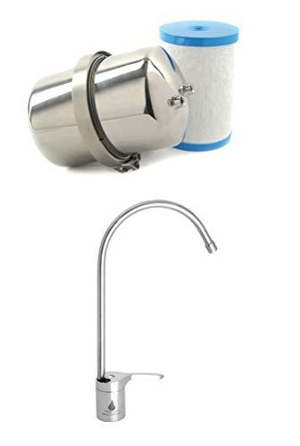 Multipure's Aquaversa Model MP750, along with below-sink connection kit and designer faucet in stainless steel to match the color of your stainless steel kitchen faucet and appliances. The Aquaversa is Multipure's most popular model (formerly known as MP750SB, and it earned a best buy rating in a leading consumer magazine.