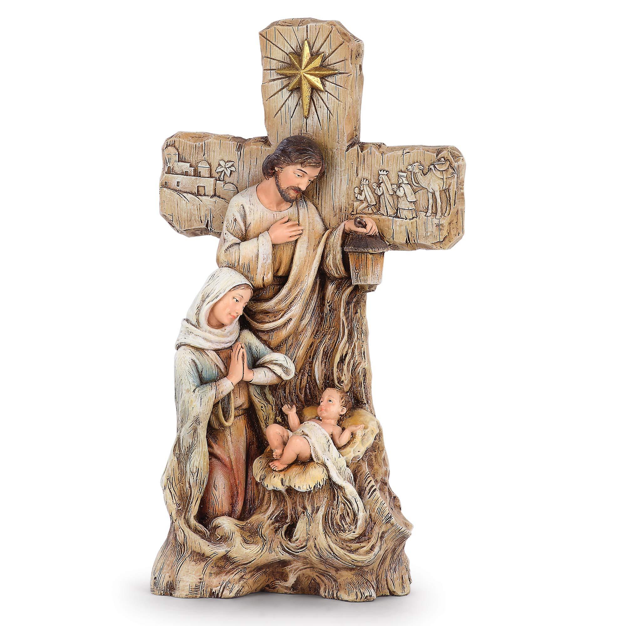 Add beauty your holidays with this lovely cross depicting the Christmas Story; Features the Holy Family loving gazing down at Baby Jesus in the manger. Designed with a wood cut look; An elegant display to commemorate Christmas; Makes a wonderful gift to yourself or others. Measures approximately 10 x 5.75 x 2.75 inches; Made of durable resin. Perfect displayed on a tabletop, shelf or nestled on a mantel. Contained in protective packaging; Ready for gifting
