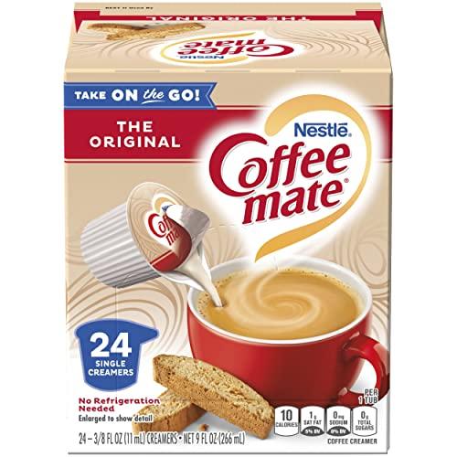 Nestle Coffee mate Original Liquid Coffee Creamer is the perfect way to create a delicious cup of velvety goodness. Smooth and rich, this original creamer delivers a warm, classic flavor that transforms every drinking experience. Coffee mate Original is non dairy, lactose free and cholesterol free. Individual coffee creamer singles make it easy to add the right amount of flavor for an easy way to transform your coffee into flavorful deliciousness. Coffee mate coffee creamer singles wake up your coffee, whether it's your morning cup or afternoon pick-me-up. Each box contains 24 non refrigerated creamer singles. Store these shelf stable single coffee creamers in a cool, dry place.
