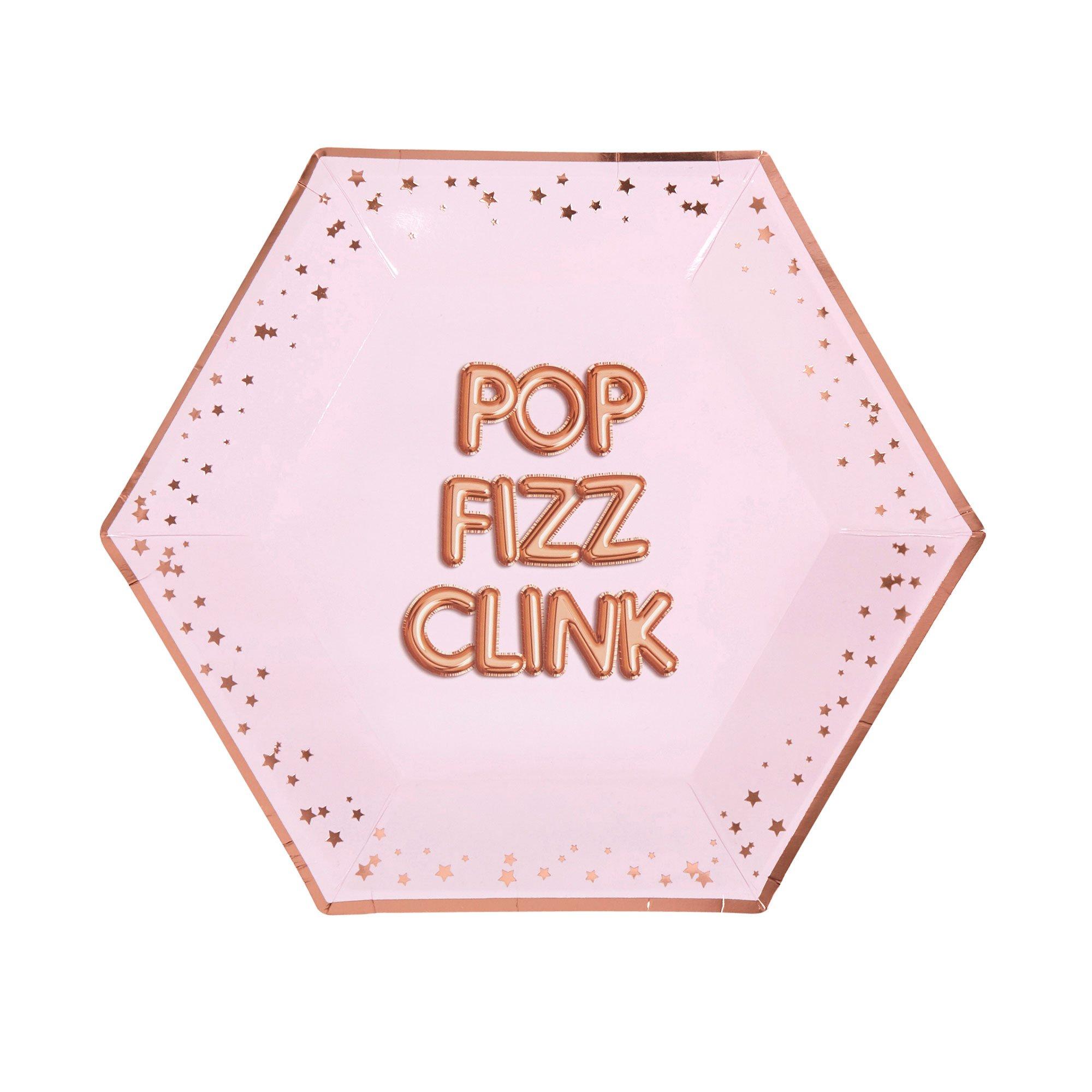 Put the fizz into your party with these glamorous pink and rose gold party plates, the perfect way to dress a variety of celebrations. Blending a pretty shade of pink with rose gold details, these unusual hexagonal plates add some delicate sparkle to your settings. The plates are edged with rose gold foil stars and have a central pop, fizz, clink logo in a fun baloon-style font. Elegant yet quirky, theyre the perfect choice for birthday, anniversary or festive celebrations.