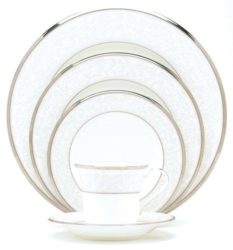 Silver Palace is made of the finest white bone china with a raised white enamel design delicately spread through shoulder and accented with a platinum band. This pure white, bone china body is as durable as it is beautiful. Extremely light and translucent, Silver Palace will add style and class to any table decor. Decorate your table with the dinnerware made for a palace. The 20 piece set contains four, five piece place settings of dinner plate, salad plate, bread and butter plate, cup and saucer.