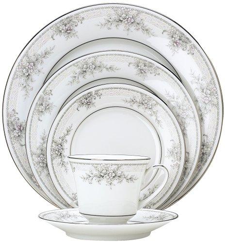 Sweet Leilani is a fine, white porcelain china dinnerware pattern richly adorned with delicate lace shoulder design in shades of blue-gray and subtle undertones of lavendar boardered by a thin platinum band. This is one of Noritake's most popular patterns and priced to fit into any budget. Simple and elegant, this timeless pattern will adapt to your ever changing lifestyle. Sweet Leilani has an array of functional serving pieces and accent pieces to fit all of your home entertainment needs. This set contains four, five piece place settings of dinner plate, salad plate, bread and butter plate, cup and saucer.