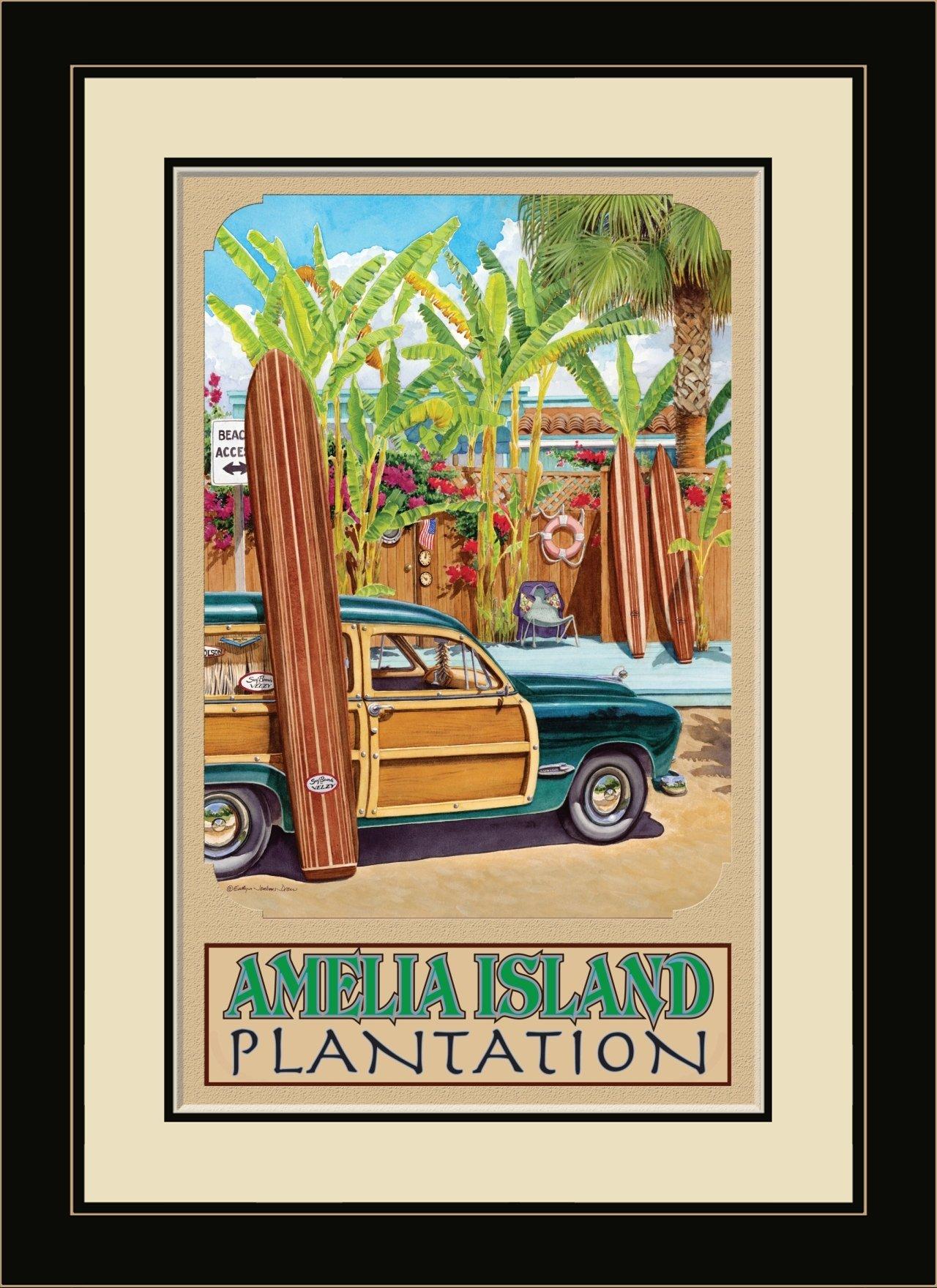 Amelia Islands Minnesota Beach Access by Artist Evelyn Jenkins Drew and Northwest Art Mall. Evelyn Jenkins Drew is a fifth generation California artist. She studied at San Jose State University in California, receiving a bachelors' degree in art in 1980. Evelyn paints bright and colorful "beachy" scenes with turquoise water and banana trees and palms that evoke the warmth of the tropical breezes of the Caribbean, California, Hawaii, and Mexico. Her art is about good times in fun places with old cars such as beautiful woodies and Volkswagen buses. Evelyn licenses art for posters, cards, metal signs, and wine labels, etc. Her art has been chosen for North Light Book's Splash 10: The best of Watercolor. She is a long time participant in the Cultural Council of Santa Cruz County's annual Open Studio Art Tour and her work has been collected internationally including in England, Canada, the Caribbean Islands, South Africa, Mexico and Trinidad. She and her husband Terry have lived in the sailing, surfing and beach culture of Santa Cruz, California for many years. They now spend four months each winter traveling on their sailboat in the Caribbean where she paints while her husband does his boat projects. During the summer and fall she exhibits in juried art festivals in California.