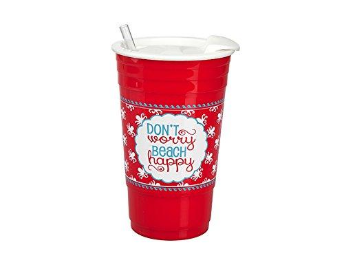 30 oz \"DON\'T worry BEACH happy\" Big Gulp Solo Cup with slide open top. Straw included. BPA free. Overall height from top to bottom is 7.5 inches and overall width from side to side is 5 inches. Made of plastic and acrylic and is top rack dishwasher safe. This item will also make a great gift addition. Get yours today!