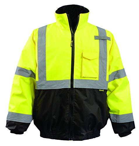 - Class 3 Black Bottom Two-Way (2-in-1) Bomber Jacket with 2" Silver Reflective Tape, Front zipper closure with inside storm flap, and Roll-away hood