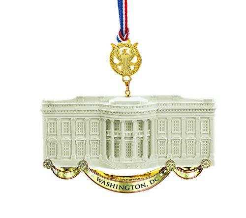 This elegant ornament is crafted with sandstone from the same Virginia quarry that produced the stone used to build the exterior walls of the White House more than 200 years ago. Commemorating White House architect James Hoban, the ornament is a detailed reproduction of the north and south faades of the White House enhanced with 24-karat gold finished brass accents.