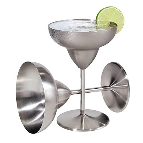 OGGI's Stainless Steel Margarita Glasses, made from high quality food grade stainless steel, are durable, unbreakable and safer than glass making them ideal for outdoor or indoor sipping. Not only will these goblets add luster to cocktail hour, the stainless steel also helps keep a chill on. With their unique look these margarita goblets are sure to grab everyone's attention. Set of two. Glasses have a 12-ounce capacity and the standard wide rim works in most salters.