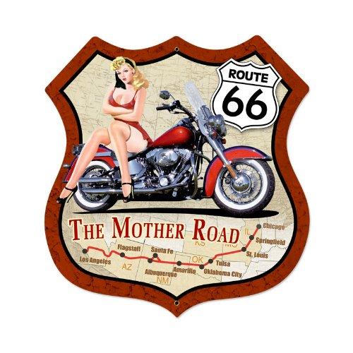 Route 66 Pinup Metal Sign Wall Decor This Route 66 Pinup shield metal sign measures 28 inches by 28 inches and weighs in at 7 lb(s). This shield metal sign is hand made in the USA using heavy gauge american steel and a process known as sublimation, where the image is baked into a powder coating for a durable and long lasting finish. This shield metal sign is drilled and riveted for easy hanging.