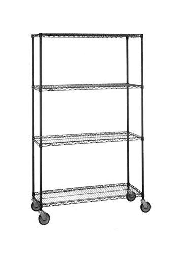 Olympic wire shelving made of carbon-steel will exceed all your storage needs. Open construction allows use of maximum storage space of cube. Each unit includes 4 posts, 4 shelves, 4 rubber swivel stem casters - 2 with brakes, 2 without - 4 donut bumpers and split-sleeves to attach shelves to posts. Black finishes are perfect for retail applications. Product Features: Open wire design that minimizes dust accumulation and allows a free circulation of air. Greater visibility of stored items and greater light penetration. Can be loaded/unloaded from all sides. Wire shelving that can change as quickly as your needs change. Shelf wires run front to back allowing for items to slide on and off shelves smoothly. Shelves can be adjusted at 1" intervals along entire length of post. Weight Capacity for mobile units is 600 lbs. per unit. NSF Approved