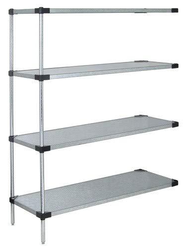 Solid shelves are a solution where dirt, dust and spills are a potential issue. The solid flat surface allows for storage from small to large items and the marine edge perimeter prevents spillage. The double hemmed 18 gauge 304 stainless steel gives the solid shelf excellent strength characteristics. Add-on kit allows you to expand your starter kit by sharing a set of posts. Configuration options include straight line, back to back and right angles (L-Shape). Add-on unit consists of 4 shelves, 2 posts and 10 shelf clamps. Additional shelves may be purchased separately. Units with add-on kits cannot be made mobile.