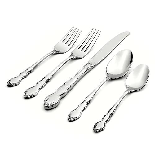 Combining traditional floral charm with an air of romance, the Oneida Dover flatware is perfect for candlelight dinners or special occasions. The pattern features sculptural sides, a flower-and-scroll motif, and a gleaming finish. Moderate in its dimensions, the pattern is crafted from heirloom-quality 18/10 stainless steel, with 18 percent chrome for maximum corrosion-resistance and 10 percent nickel for rich luster. Full service for 1, this place setting includes a 6-inch teaspoon, 6-1/2-inch place spoon, 9-inch place knife, 7-1/4-inch place fork, and 6-1/2-inch salad fork. The set is dishwasher-safe and carries a lifetime warranty. Dover is also part of Oneida's Flatware for a Lifetime program, so you can add to your collection for as long as you like. --Emily Bedard