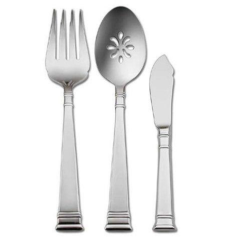 Adorned with graceful bands at the tip and shank of the handle, Prose offers a comfortable understated look for entertaining. This transitional style is in 18/8 stainless steel. Great for family dining or entertaining, combining durability with a beautiful finish. Oneida, the leading name in flatware, has been setting tables for generations. Oneida's highest quality stainless flatware, the three-piece Serving Set includes: Large Serving Fork, Butter Knife, and Pierced Spoon.