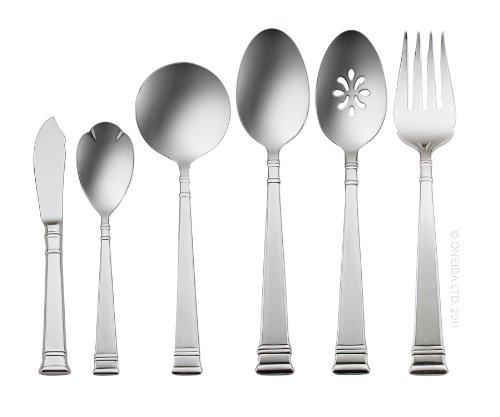 - 6-piece set includes: one each: serve spoon, pierced serve spoon, serve fork, gravy ladle, butter knife and sugar spoon